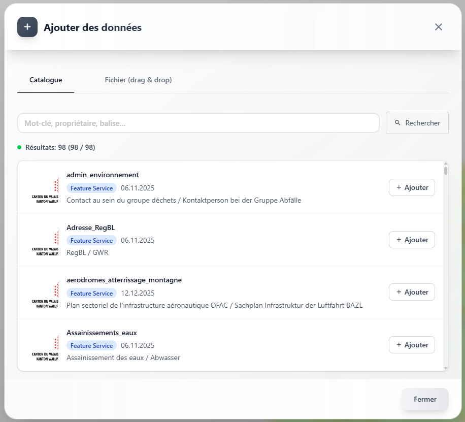 L’onglet Ajouter permet d’ajouter des couches depuis le catalogue de données.