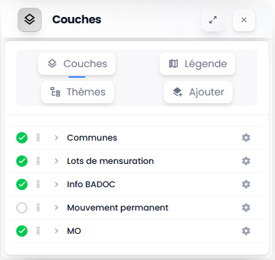 en cliquant sur l'icône couche cette fenêtre s'ouvre et cette liste permet notamment :