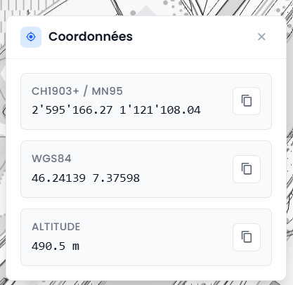 En faisant un clic-droit sur la carte, il est également possible d'afficher les coordonnées (planimétriques et altimétrique) du point cliqué, et de les copier dans le presse-papiers.