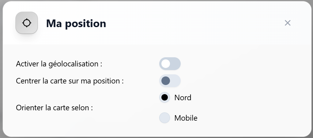 - Centrage de la carte : on force le centre de la carte sur la position de l'utilisateur, même s'il est en mouvement.