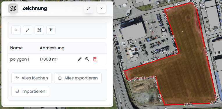 Die Zeichnungen können im GeoJSON-Format ausgetauscht werden, indem Sie auf Importieren oder Alles exportieren klicken.