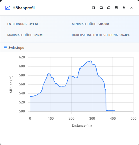 Die Option Höhenprofil ermöglicht es, das Geländeprofil entlang der Linie zu extrahieren: