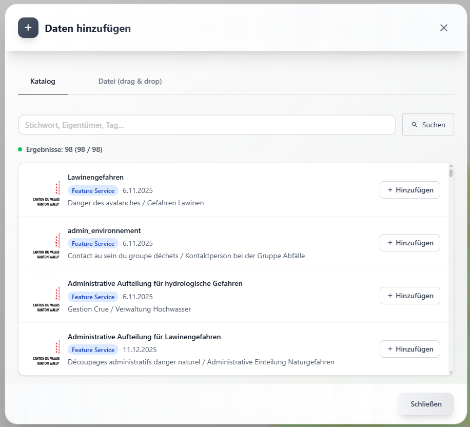 Der Tab Hinzufügen ermöglicht das Hinzufügen von Layern aus dem Datenkatalog.