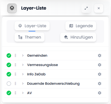 Jeder Layer kann einzeln ein- oder ausgeschaltet werden, indem auf den Kreis links geklickt wird.