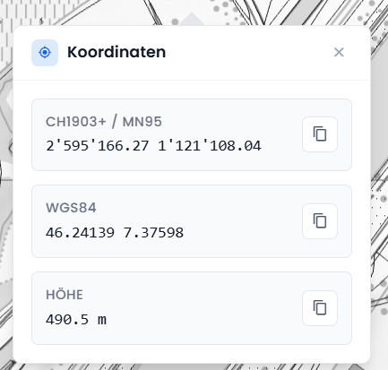 Durch einen Rechtsklick auf die Karte können auch die Koordinaten (planimetrisch und altimetrisch) des angeklickten Punktes angezeigt und in die Zwischenablage kopiert werden.