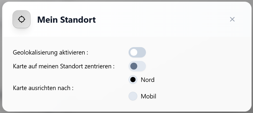Die Geolokalisierungs-Schaltfläche (auf der rechten Seite des Bildschirms) ermöglicht es dem Benutzer, seinen Standort auf der Karte hervorzuheben.