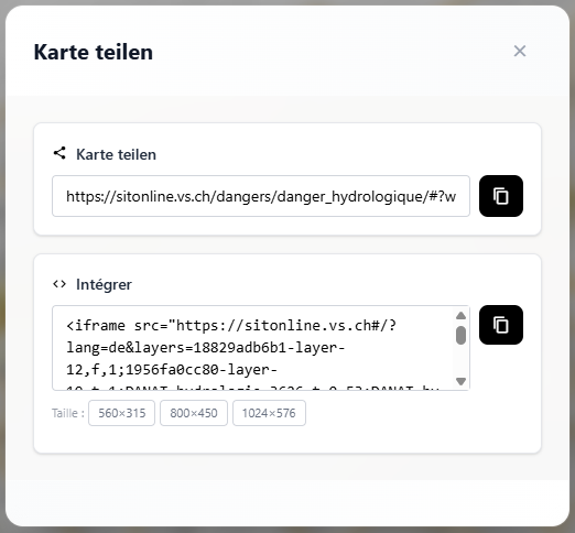 Sie können zwischen mehreren vordefinierten Grössen wählen (560×315, 800×450, 1024×576), um die Anzeige an Ihr Layout anzupassen.